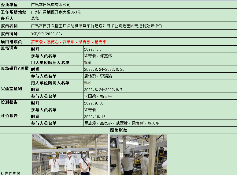 广汽本田开发区工厂发动机装配车间建设项目职业病危害因素控制效果评价