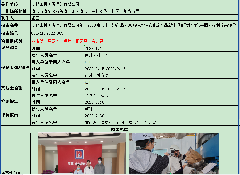 立邦涂料(清远)有限公司年产2000吨水性收边产品、30万吨水性乳胶漆产品新建项目职业病危害因素控制效果评价