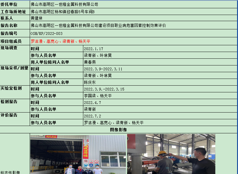 佛山市高明区一世隆金属科技有限公司建设项目职业病危害因素控制效果评价