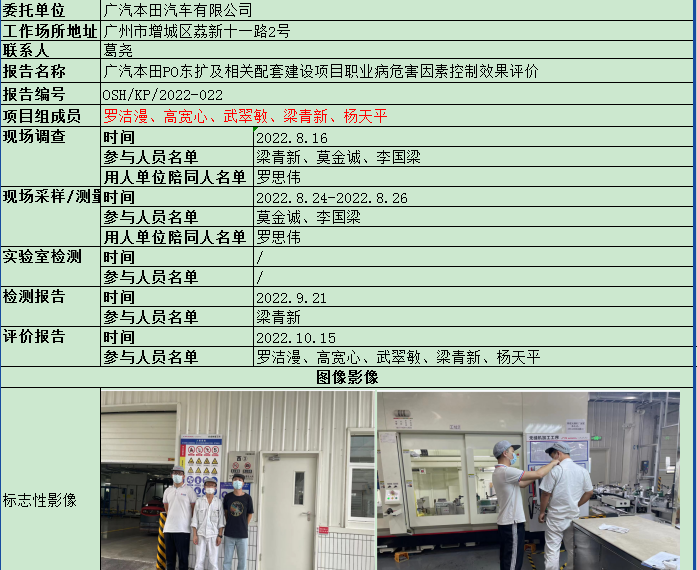 广汽本田PO东扩及相关配套建设项目职业病危害因素控制效果评价
