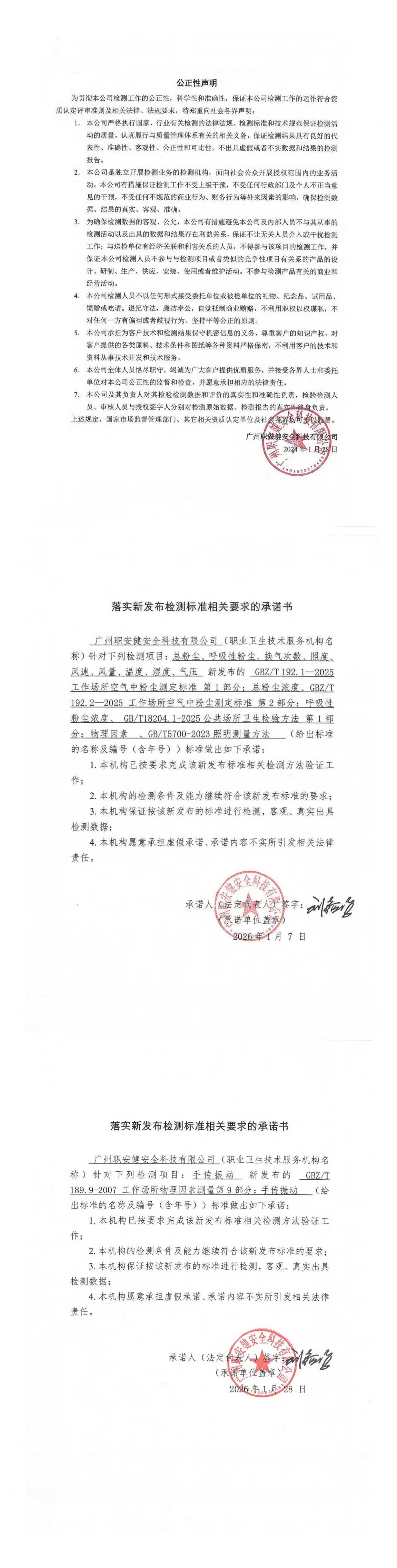 广州职安健2016年首次取得职业卫生技术服务机构资质证书,真竭诚为广大工企业提供职业病危害因素检测与评价、用人单位现状评价、建设项目职业病防护设施“三同时”等技术服务。我司承诺执行国家、行业有关职业卫生的法律法规、标准、规范,保证技术服务公正、诚信、科学、严谨。