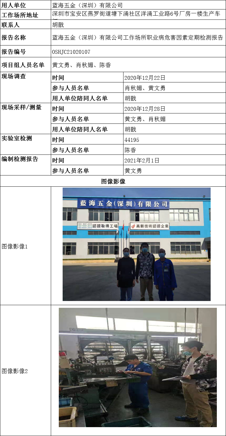 蓝海五金(深圳)有限公司工作场所职业病危害因素定期检测
