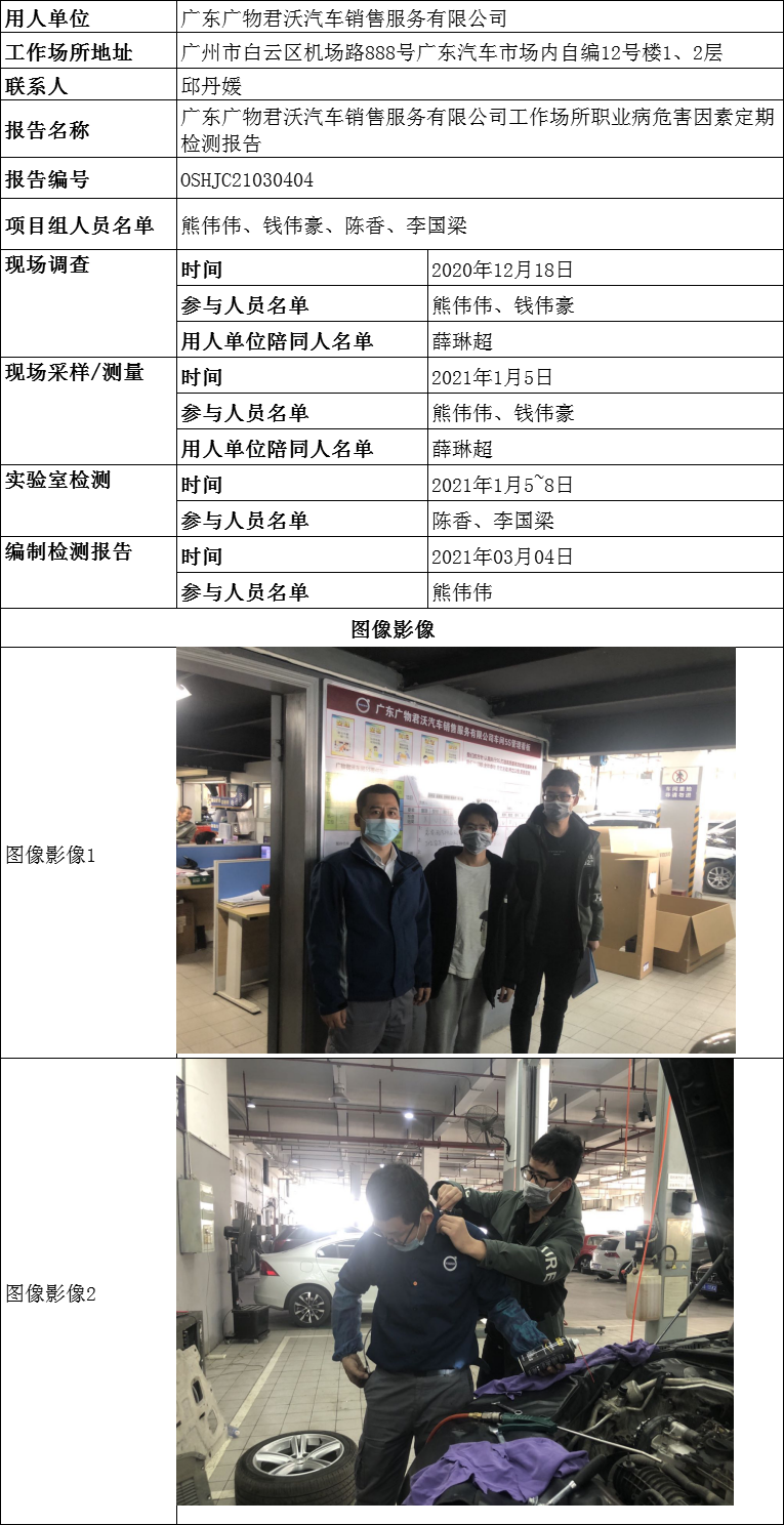 广东广物君沃汽车销售服务有限公司工作场所职业病危害因素定期检测