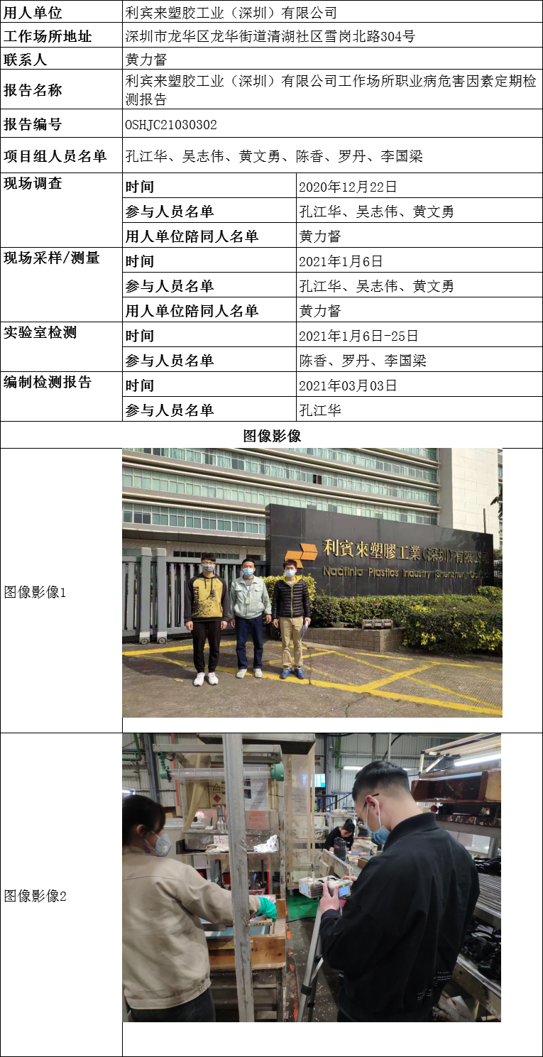 利宾来塑胶工业(深圳)有限公司工作场所职业病危害因素定期检测