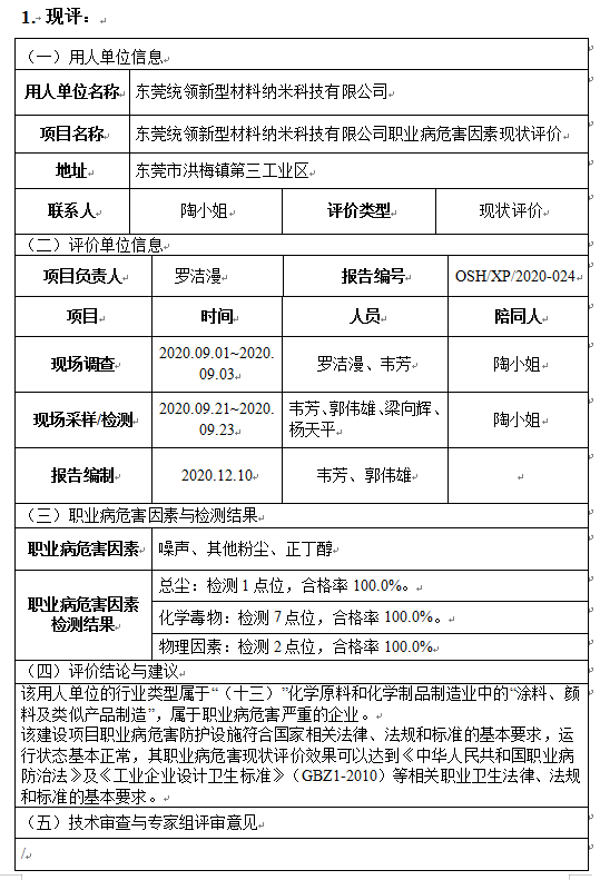 东莞统领新型材料纳米科技有限公司职业病危害因素现状评价