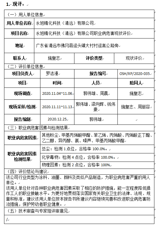 永旭精化科技(清远)有限公司职业病危害现状评价
