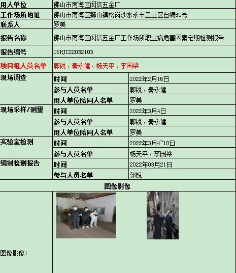 佛山市南海区闳信五金厂工作场所职业病危害因素定期检测报告