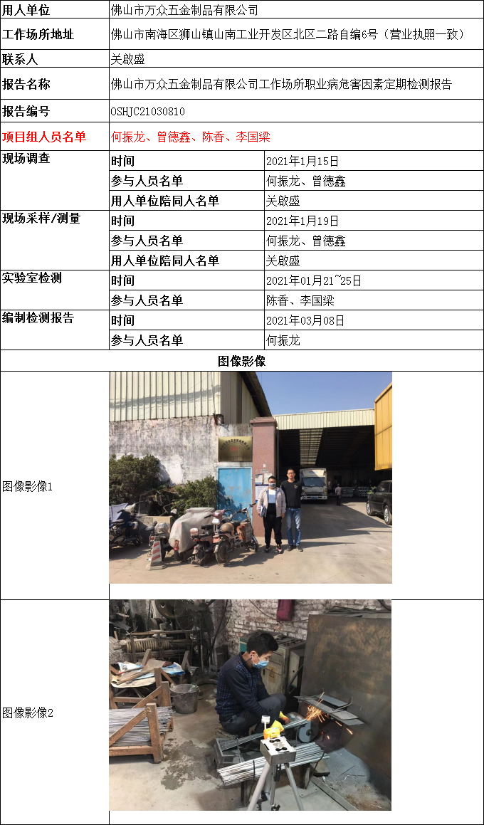佛山市万众五金制品有限公司工作场所职业病危害因素定期检测报告