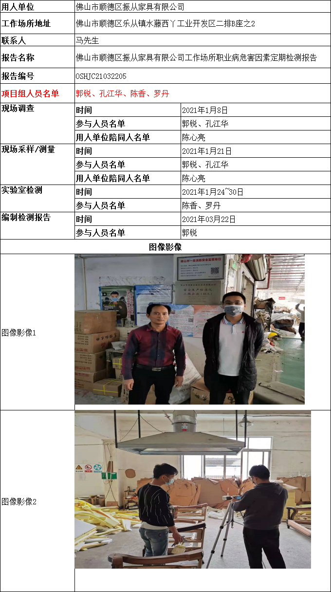 佛山市顺德区振从家具有限公司工作场所职业病危害因素定期检测报告