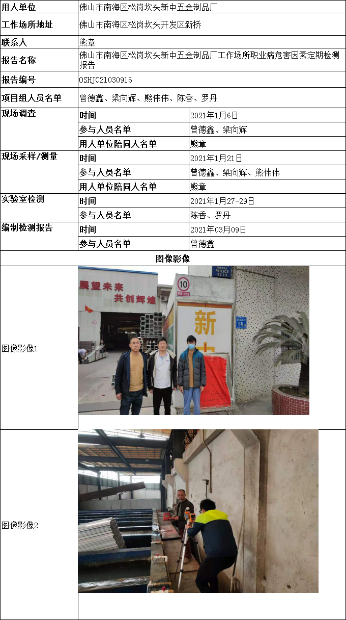 佛山市南海区松岗坎头新中五金制品厂工作场所职业病危害因素定期检测报告