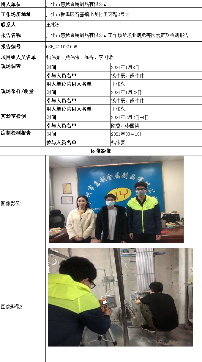 广州市惠越金属制品有限公司工作场所职业病危害因素定期检测报告
