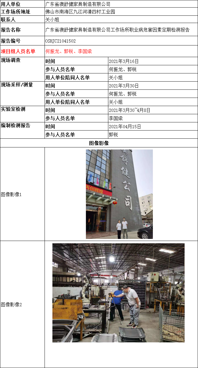 广东省澳舒健家具制造有限公司工作场所职业病危害因素定期检测报告