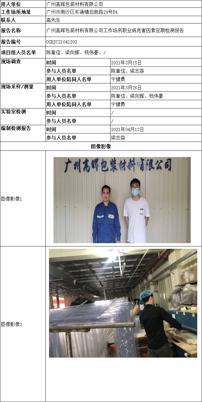 广州高晖包装材料有限公司工作场所职业病危害因素定期检测报告