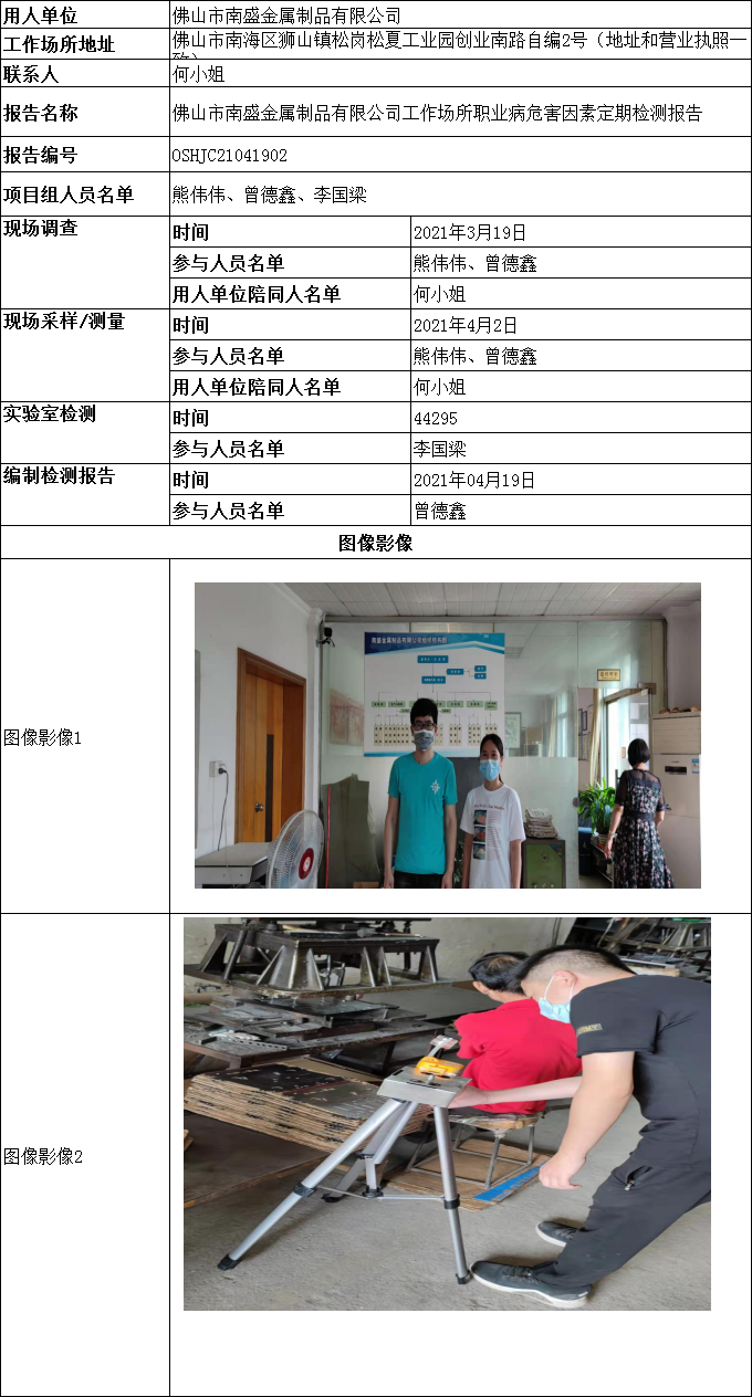 佛山市南盛金属制品有限公司工作场所职业病危害因素定期检测报告