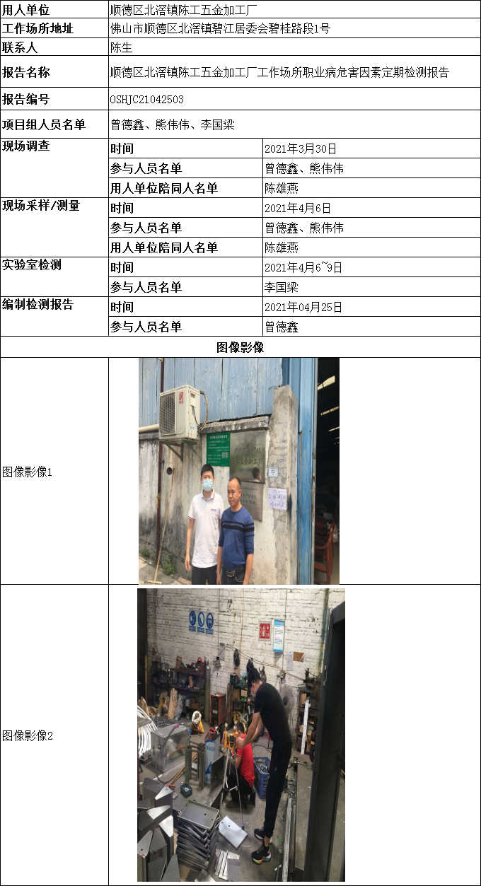 顺德区北滘镇陈工五金加工厂工作场所职业病危害因素定期检测报告