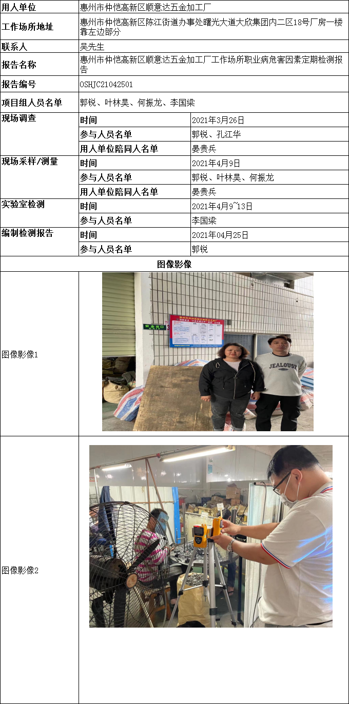 惠州市仲恺高新区顺意达五金加工厂工作场所职业病危害因素定期检测报告