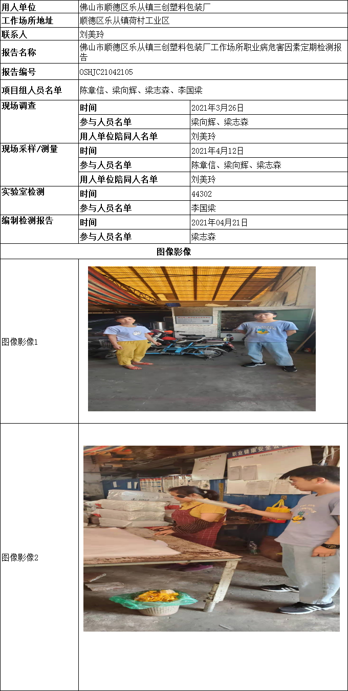佛山市顺德区乐从镇三创塑料包装厂工作场所职业病危害因素定期检测报告