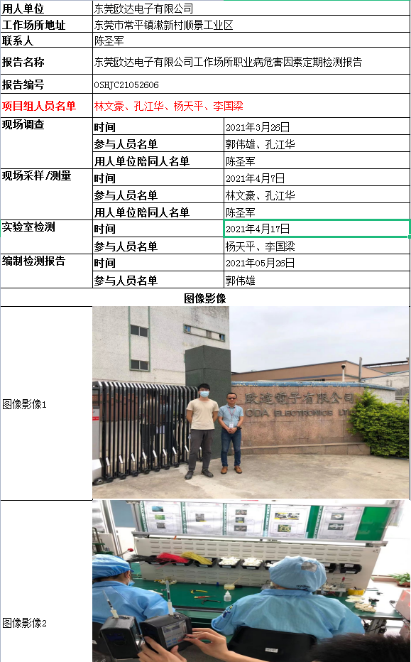 东莞欧达电子有限公司工作场所职业病危害因素定期检测报告