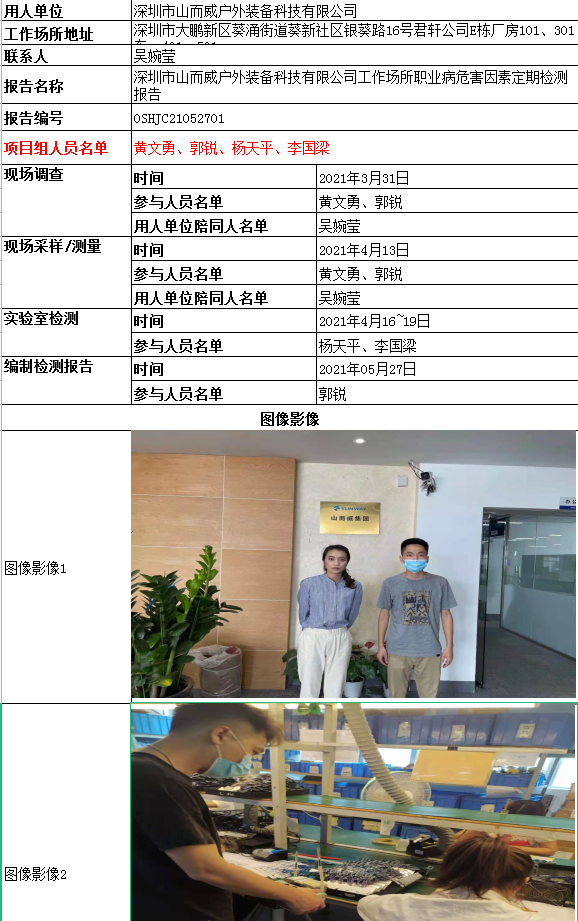 深圳市山而威户外装备科技有限公司工作场所职业病危害因素定期检测报告