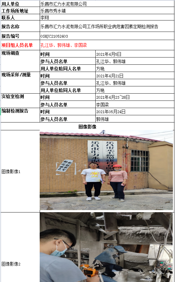 乐昌市汇力水泥有限公司工作场所职业病危害因素定期检测报告
