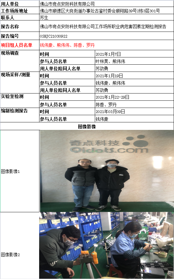 佛山市奇点安防科技有限公司工作场所职业病危害因素定期检测报告
