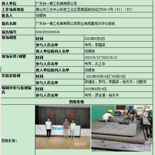 广东台一精工机械有限公司职业病危害现状评价报告