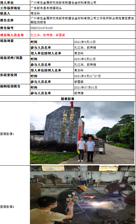 广州有色金属研究院新丰耐磨合金材料有限公司工作场所职业病危害因素定期检测报告